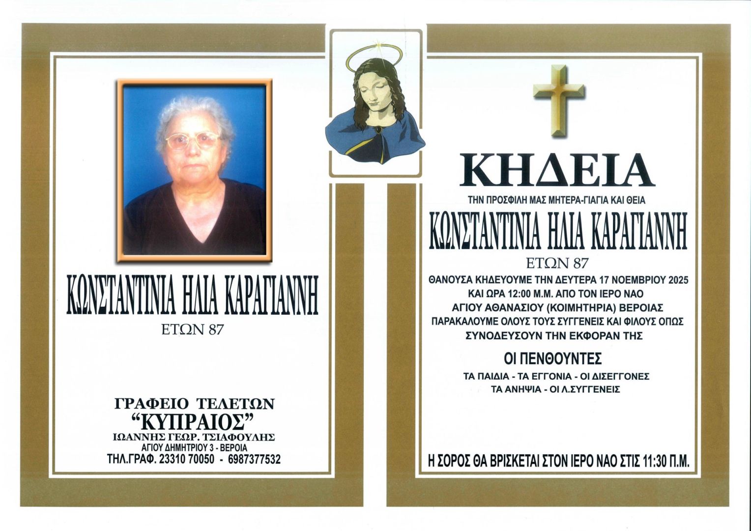 Έφυγε από τη ζωή και κηδεύεται την Δευτέρα 17 Νοεμβρίου 2025 στις 12.00 μ.μ. από τον Ιερό Ναό Αγίου Αθανασίου (Κοιμητήρια) Βέροιας η Κωνσταντινιά Ηλ. Καραγιάννη σε ηλικία 87 ετών.