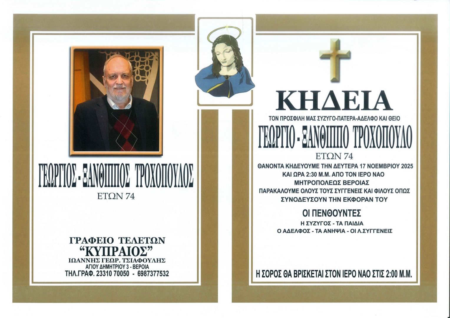 Έφυγε από τη ζωή και κηδεύεται την Δευτέρα 17 Νοεμβρίου 2025 στις 2.30 μ.μ. από τον Ιερό Ναό Μητροπόλεως Βέροιας ο Γεώργιος Ξάνθιππος Τροχόπουλος σε ηλικία 74 ετών.