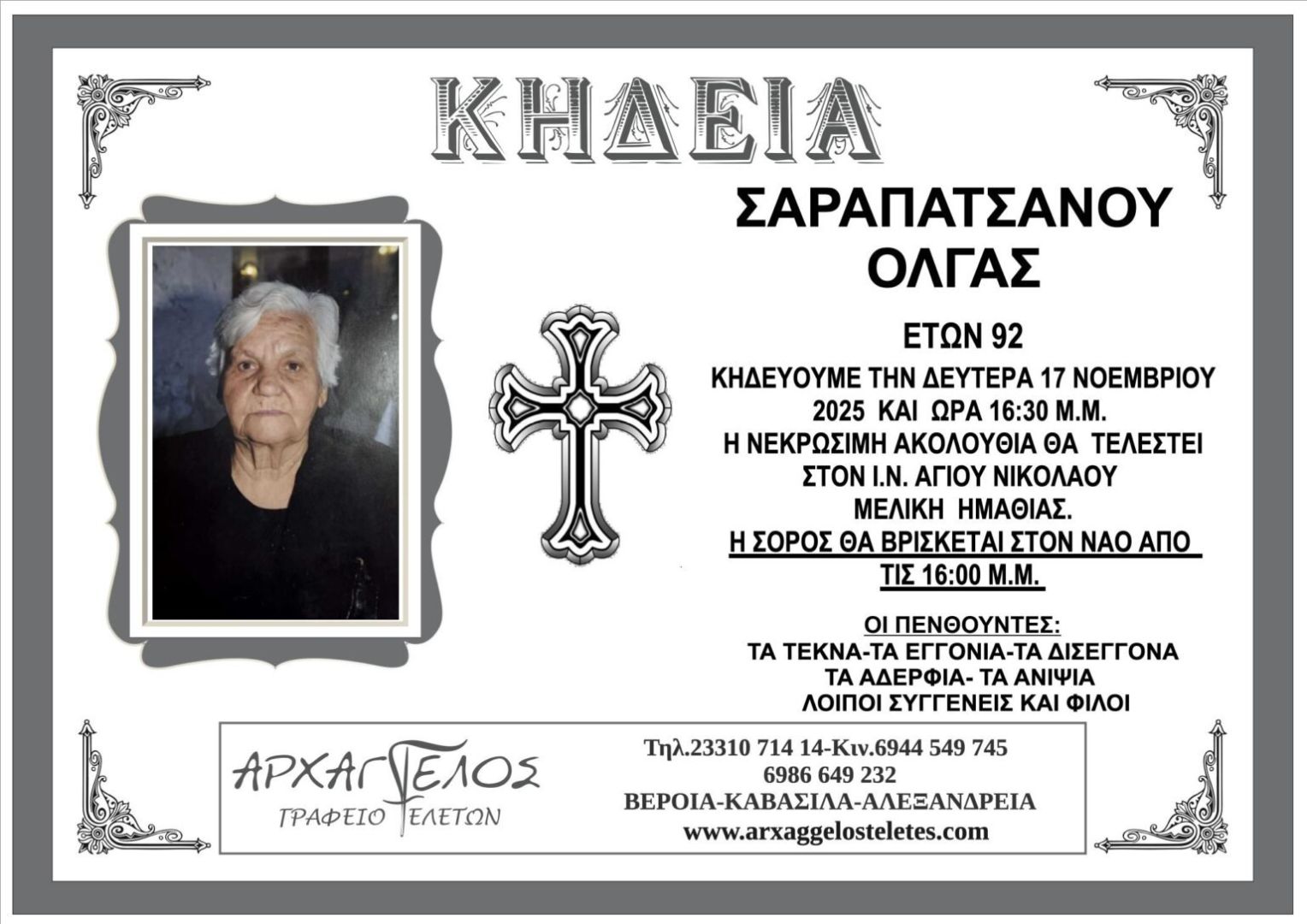 Έφυγε από τη ζωή και κηδεύτηκε την Δευτέρα 17 Νοεμβρίου 2025 στις 4.30 μ.μ. από τον Ιερό Ναό Αγίου Νικολάου Μελίκης Ημαθίας η Όλγα Σαραπατσάνου σε ηλικία 92 ετών.