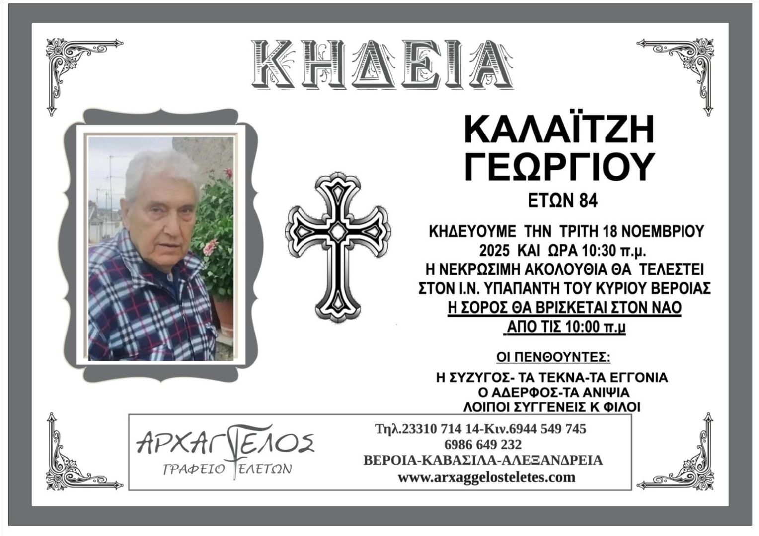 Έφυγε από τη ζωή και κηδεύεται την Τρίτη 18 Νοεμβρίου 2025 στις 10.30 π.μ. από τον Ιερό Ναό Υπαπαντής του Κυρίου Βέροιας ο Γεώργιος Καλαϊτζής σε ηλικία 84 ετών.