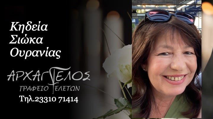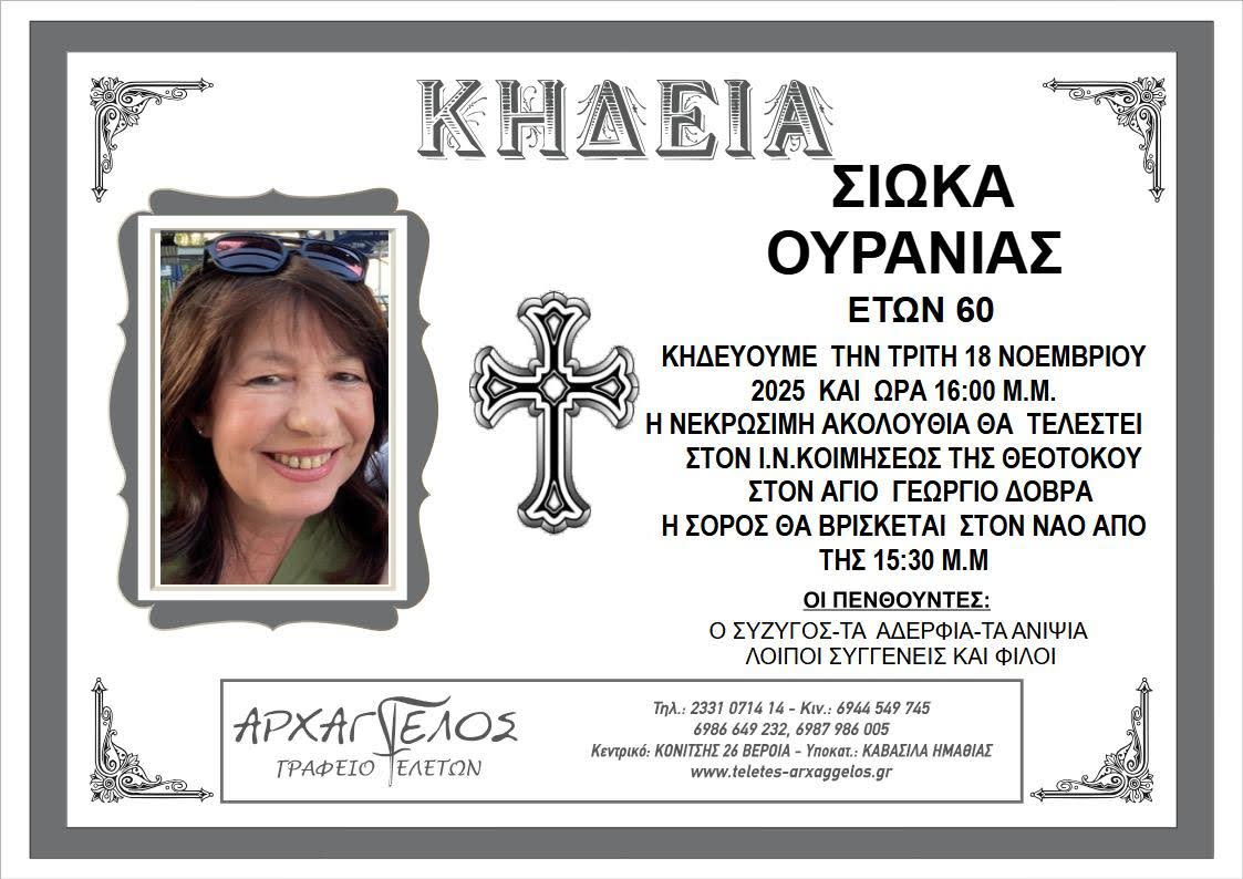 Έφυγε από τη ζωή και κηδεύτηκε σήμερα Τρίτη 18 Νοεμβρίου 2025 στις 4.00 μ.μ. από τον Ιερό Ναό Κοιμήσεως της Θεοτόκου στον Άγιο Γεώργιο Δοβρά η Ουρανία Σιώκα σε ηλικία 60 ετών.