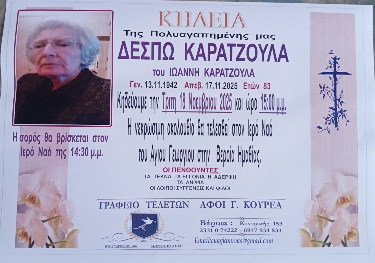 Έφυγε από τη ζωή και κηδεύτηκε σήμερα Τρίτη 18 Νοεμβρίου 2025 στις 3.00 μ.μ. από τον Ιερό Ναό Αγίου Γεωργίου Βέροιας η Δέσπω Καρατζούλα σε ηλικία 83 ετών.