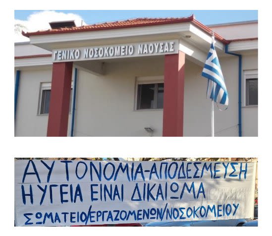 Το σωματείο εργαζομένων του Γ.Ν. Νάουσας , καλεί την δημοτική αρχή , τους βουλευτές, την περιφέρεια Ημαθίας, την ΠΟΕΔΗΝ, την ΑΔΕΔΥ, τους πολίτες, εργαζόμενους σε όλους τους φορείς, να παραβρεθούν στην συγκέντρωση που θα πραγματοποιηθεί την Τετάρτη, 19-11-2025 στις 5.00 το απόγευμα, στην είσοδο του νοσοκομείου, με χαιρετισμούς, ομιλία και πορεία προς το δημαρχείο.