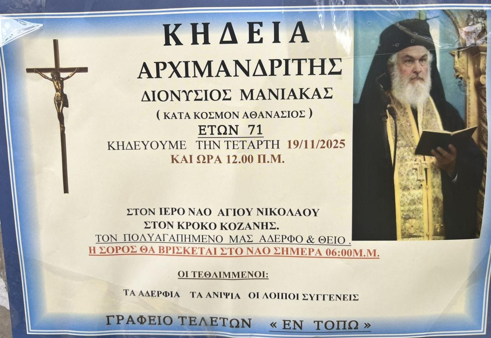 Ο μακαριστός Αρχιμανδρίτης κηδεύτηκε σήμερα Τετάρτη 19 Νοεμβρίου 2025 στον Ι.Ν. Αγ. Νικολάου στην ιδιαίτερη πατρίδα του, στον Κρόκο Κοζάνης.