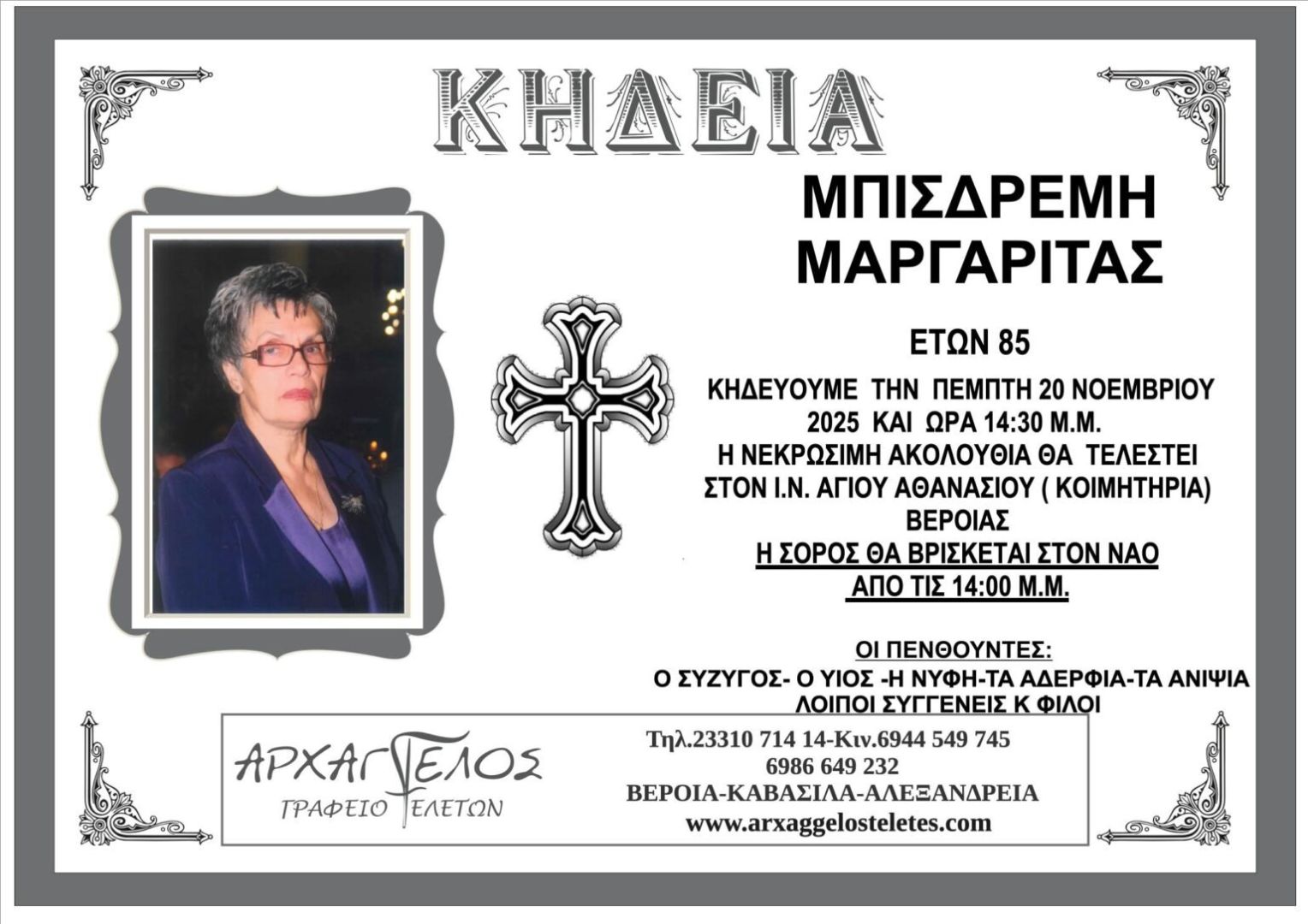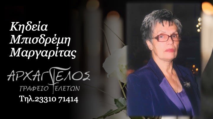 Έφυγε από τη ζωή και κηδεύεται την Πέμπτη 20 Νοεμβρίου 2025 στις 2.30 μ.μ. από τον Ιερό Ναό Αγίου Αθανασίου (Κοιμητήρια) Βέροιας η Μαργαρίτα Μπισδρέμη σε ηλικία 85 ετών.