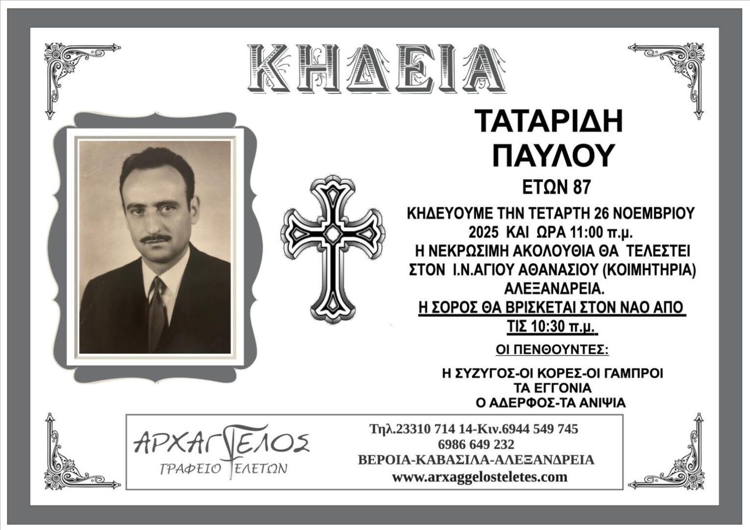 Έφυγε από τη ζωή και κηδεύεται την Τετάρτη 26 Νοεμβρίου 2025 στις 11.00 π.μ. από τον Ιερό Ναό Αγίου Αθανασίου (Κοιμητήρια) Αλεξάνδρειας ο Παύλος Ταταρίδης σε ηλικία 87 ετών.
