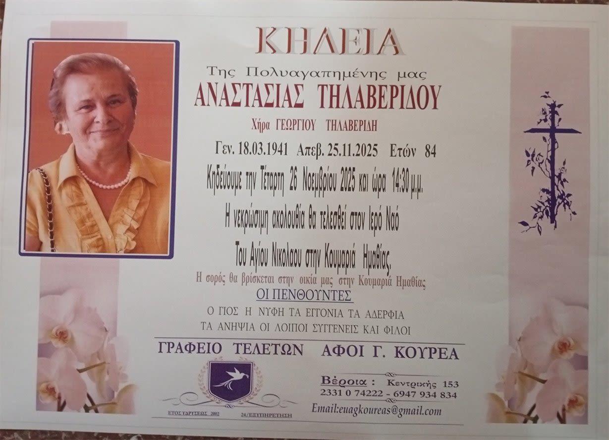Έφυγε από τη ζωή και κηδεύεται την Τετάρτη 26 Νοεμβρίου 2025 στις 2.30 μ.μ. από τον Ιερό Ναό Αγίου Νικολάου στην Κουμαριά Ημαθίας η Αναστασία Τηλαβερίδου σε ηλικία 84 ετών.