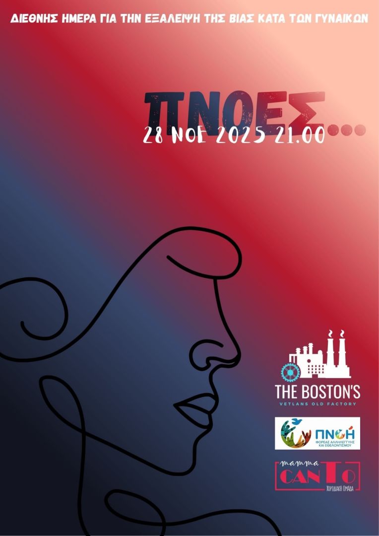 Ο Φορέας Κοινωνικής Αλληλεγγύης και Εθελοντισμού ΠΝΟΗ με αφορμή την 25η Νοεμβρίου, Διεθνή ημέρα για την εξάλειψη της βίας κατά των γυναικών διοργανώνει την Παρασκευή 28 Νοεμβρίου 2025 στις 21.00, μουσική βραδιά στο Boston’s Vetlan’s Old Factory, με σκοπό την ευαισθητοποίηση και την ενημέρωση του κοινού για θέματα βίας και κακοποίησης.