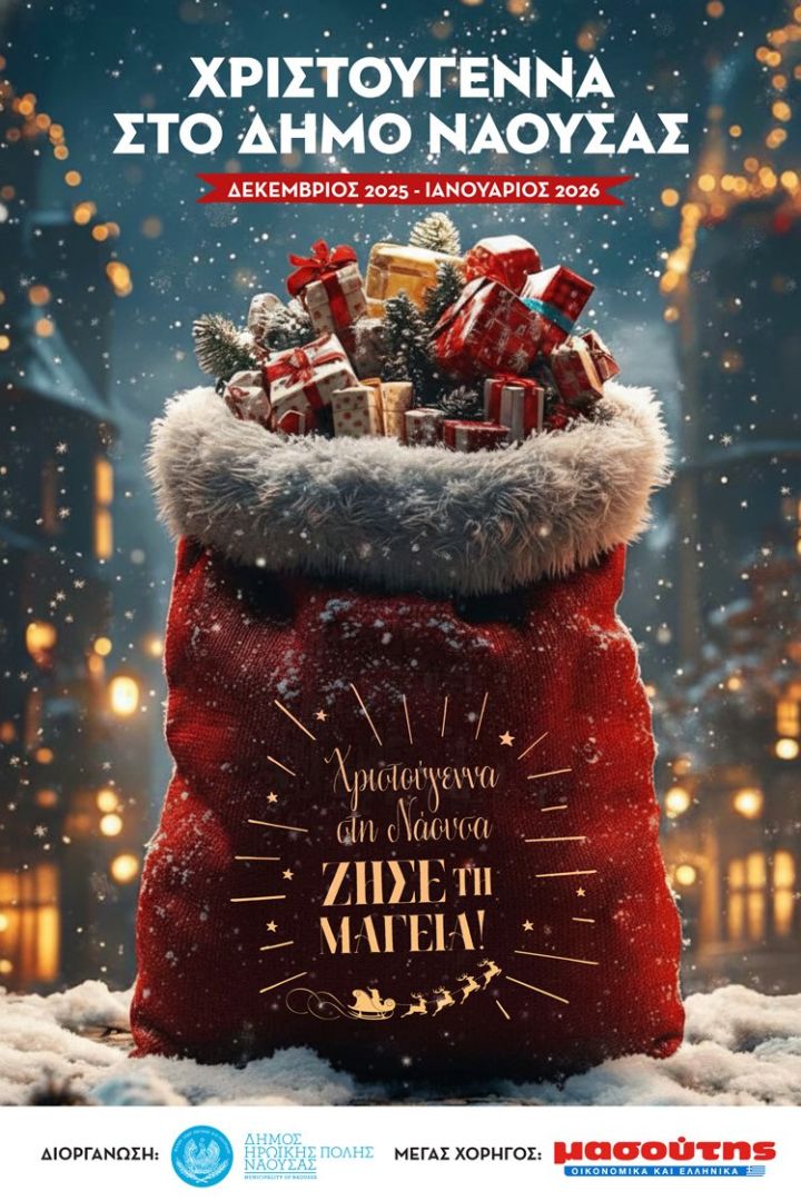 Ο Δήμος Ηρωικής Πόλης Νάουσας σας προσκαλεί να ζήσετε τη μαγεία των Χριστουγέννων μέσα από μια σειρά από γιορτινές πολιτιστικές εκδηλώσεις και εμπειρίες που θα φωτίσουν κάθε γωνιά της πόλης και των Δημοτικών Ενοτήτων της. Καθ’ όλη τη διάρκεια της εορταστικής περιόδου, σε συνεργασία με τοπικούς πολιτιστικούς συλλόγους και φορείς, η Νάουσα μεταμορφώνεται σε έναν ζεστό, φιλόξενο προορισμό για μικρούς και μεγάλους.