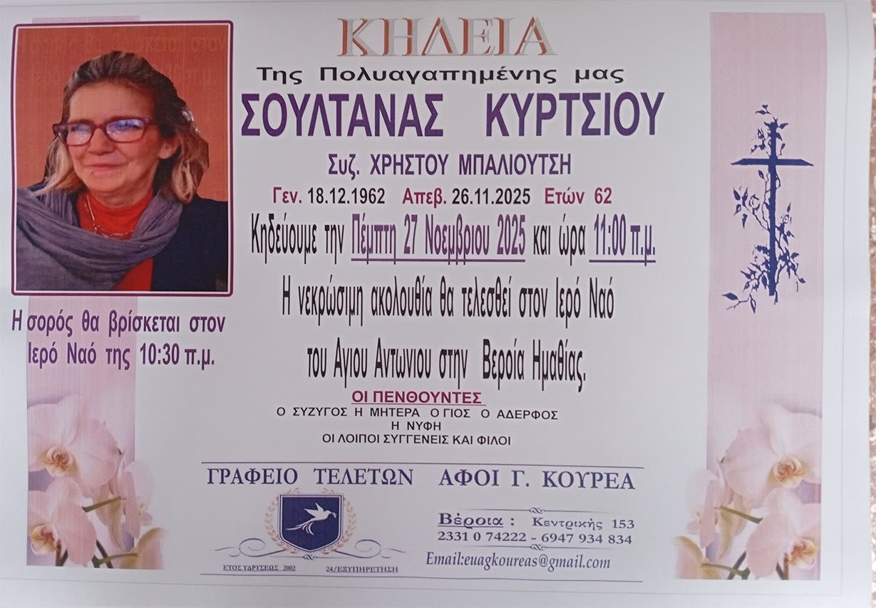 Έφυγε από τη ζωή και κηδεύεται την Πέμπτη 27 Νοεμβρίου 2025 στις 11.00 π.μ. από τον Ιερό Ναό Αγίου Αντωνίου Βέροιας η Σουλτάνα Κύρτσιου σε ηλικία 62 ετών.