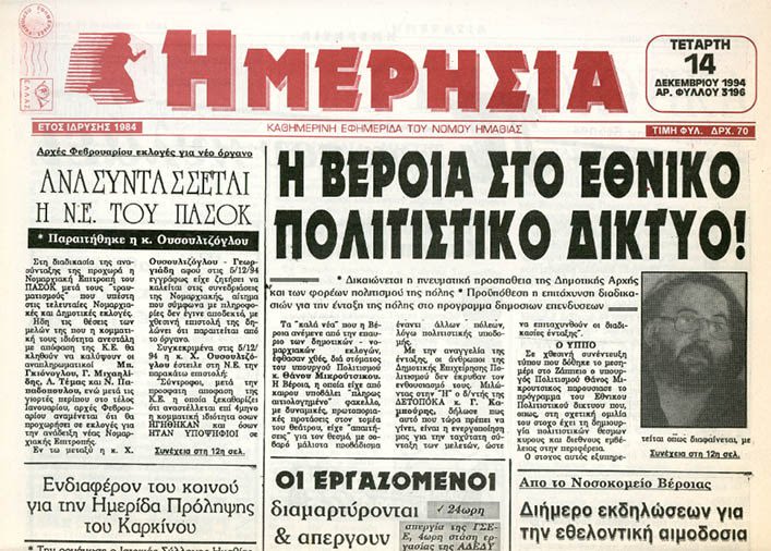 φωτος : Εφημερίδα «Ημερήσια» 14 Δεκεμβρίου 1994 με πρωτοσέλιδο της ένταξη μας στο ΕΠΔΠ και φωτογραφία μακέτας της προμελέτης του Χώρου Τεχνών.