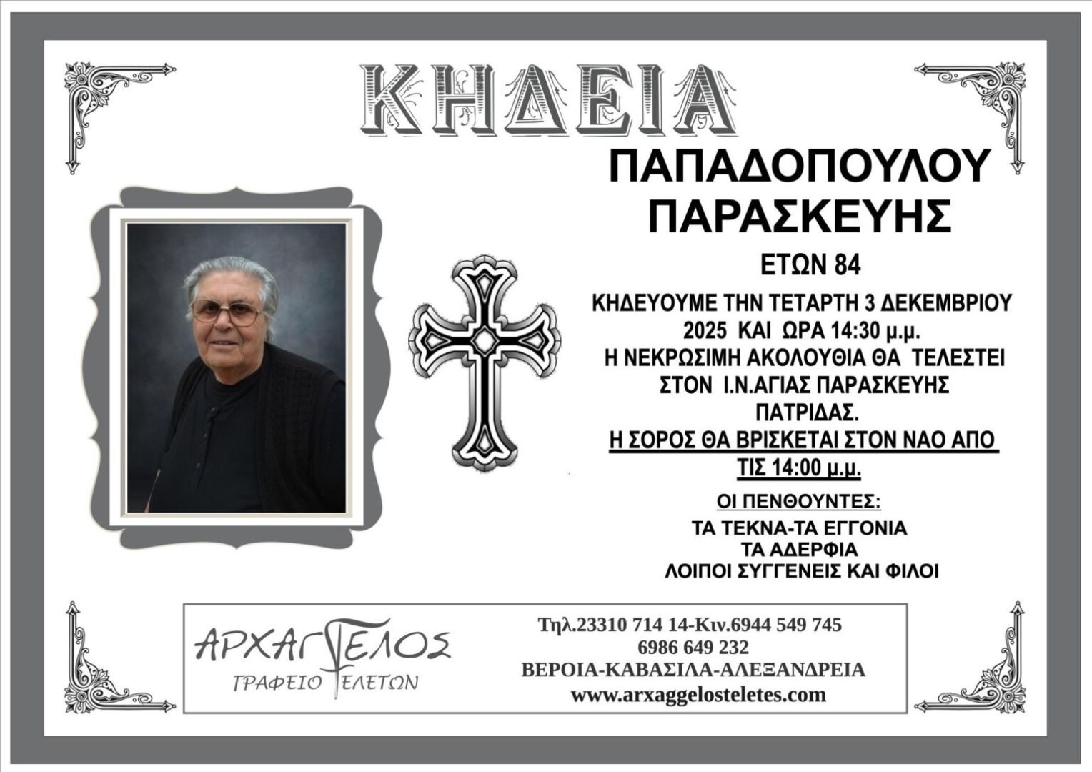 Έφυγε από τη ζωή και κηδεύεται την Τετάρτη 3 Δεκεμβρίου 2025 στις 2.30 μ.μ. από τον Ιερό Ναό Αγίας Παρασκευής Πατρίδας η Παρασκευή Παπαδοπούλου σε ηλικία 84 ετών.