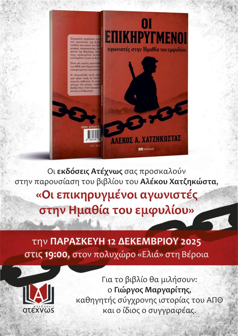 Οι εκδόσεις «Ατεχνως» παρουσιάζουν το νέο βιβλίο του Ημαθιώτη δημοσιογράφου-συγγραφέα Αλέκου Χατζηκώστα «Οι επικηρυγμένοι αγωνιστές στην Ημαθία του Εμφυλίου» που θα γίνει την Παρασκευή 12 Δεκέμβρη στις 7μ.μ στον πολυχώρο «ΕΛΙΑ» στη Βέροια.