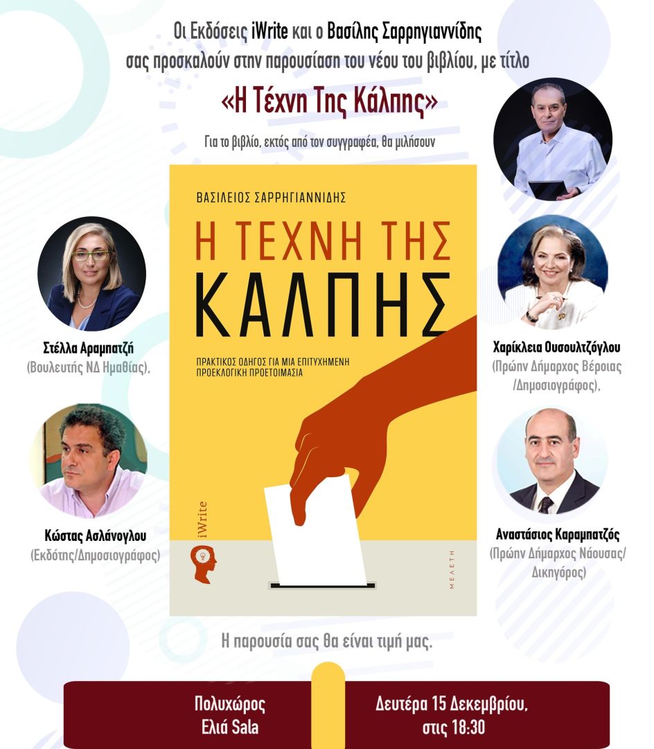 Την Δευτέρα 15 Δεκεμβρίου 2025 στις 18:30 στον Πολυχώρο Ελιά Sala παρουσιάζεται το βιβλίο του δημοσιογράφου Βασίλη Σαρρηγιαννίδη «Η Τέχνη Της Κάλπης» (εκδόσεις iWrite).