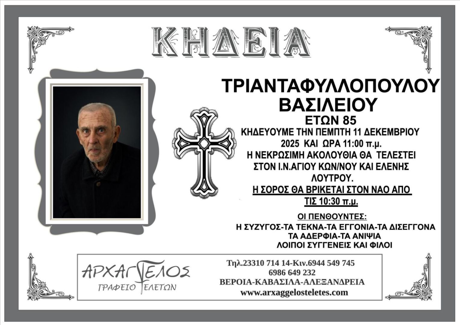 Έφυγε από τη ζωή και κηδεύεται την Πέμπτη 11 Δεκεμβρίου 2025 στις 11.00 π.μ. από τον Ιερό Ναό Αγίου Κων/νου και Ελένης Λουτρού ο Βασίλειος Τριανταφυλλόπουλος σε ηλικία 85 ετών.