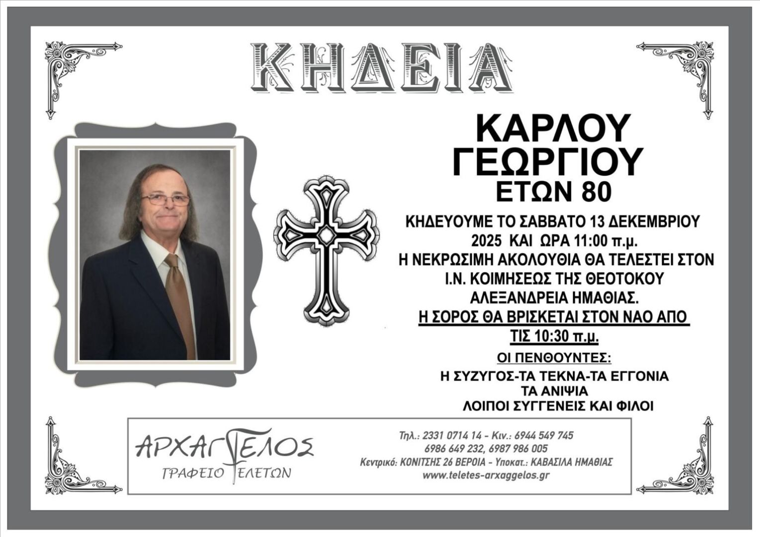 Έφυγε από τη ζωή και κηδεύεται το Σάββατο 13 Δεκεμβρίου 2025 στις 11.00 π.μ. από τον Ιερό Ναό Κοιμήσεως της Θεοτόκου Αλεξάνδρειας Ημαθίας ο Γεώργιος Κάρλος σε ηλικία 80 ετών.