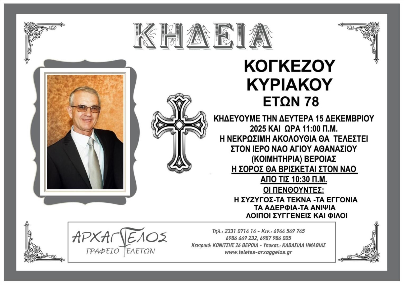 Έφυγε από τη ζωή και κηδεύεται την Δευτέρα 15 Δεκεμβρίου 2025 στις 11.00 π.μ. από τον Ιερό Ναό Αγίου Αθανασίου (Κοιμητήρια) Βέροιας ο Κυριάκος Κογκέζος σε ηλικία 78 ετών.
