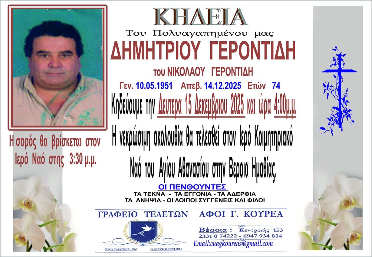 Έφυγε από τη ζωή και κηδεύεται την Δευτέρα 15 Δεκεμβρίου 2025 στις 4.00 μ.μ. από τον Ιερό Ναό Αγίου Αθανασίου (Κοιμητήρια) Βέροιας ο Δημήτριος Γεροντίδης σε ηλικία 74 ετών.