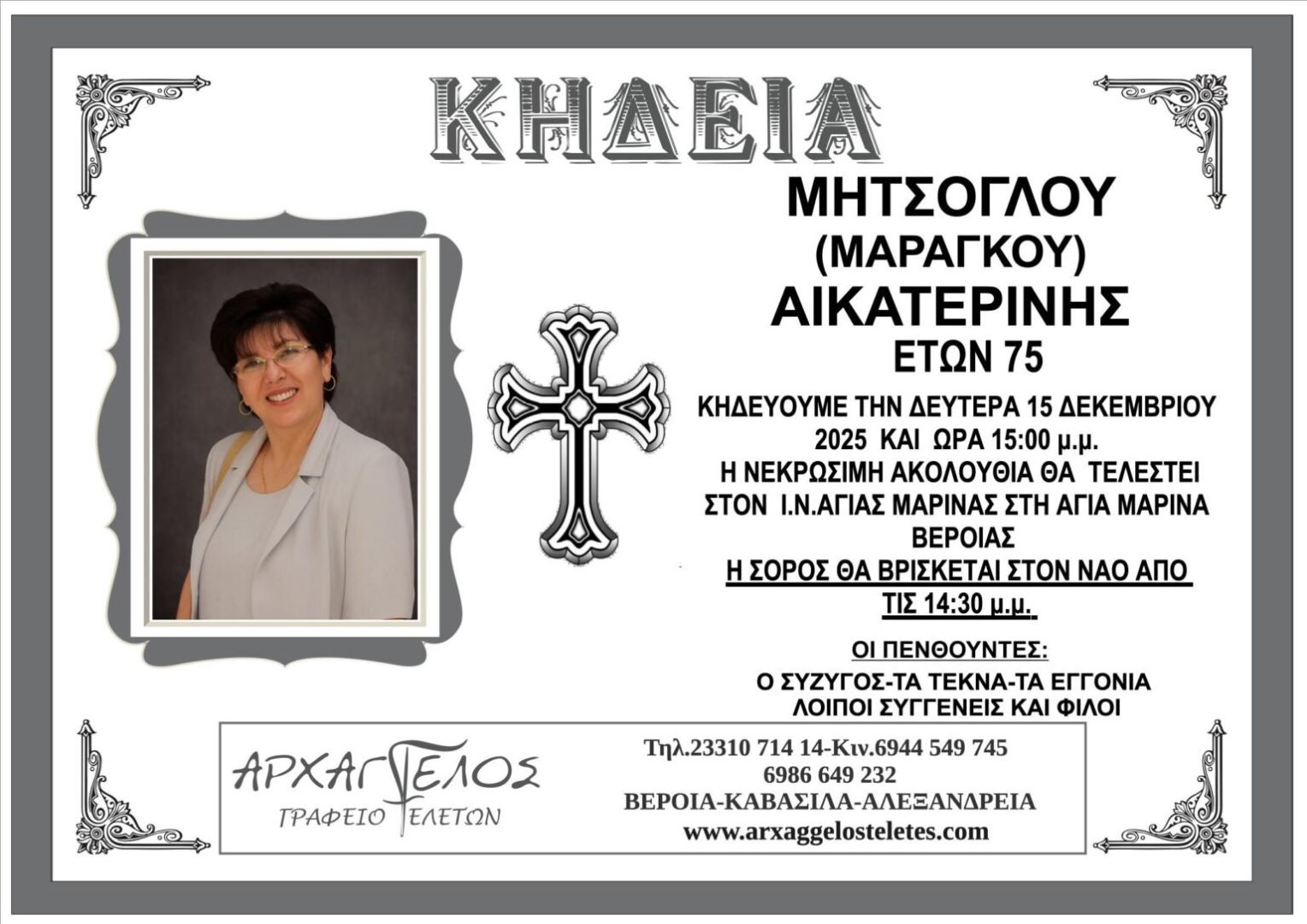 Έφυγε από τη ζωή και κηδεύτηκε σήμερα Δευτέρα 15 Δεκεμβρίου 2025 στις 3.00 μ.μ. από τον Ιερό Ναό Αγίας Μαρίνας στην Αγία Μαρίνα Βέροιας η Αικατερίνη Μητσόγλου Μαραγκού σε ηλικία 75 ετών.