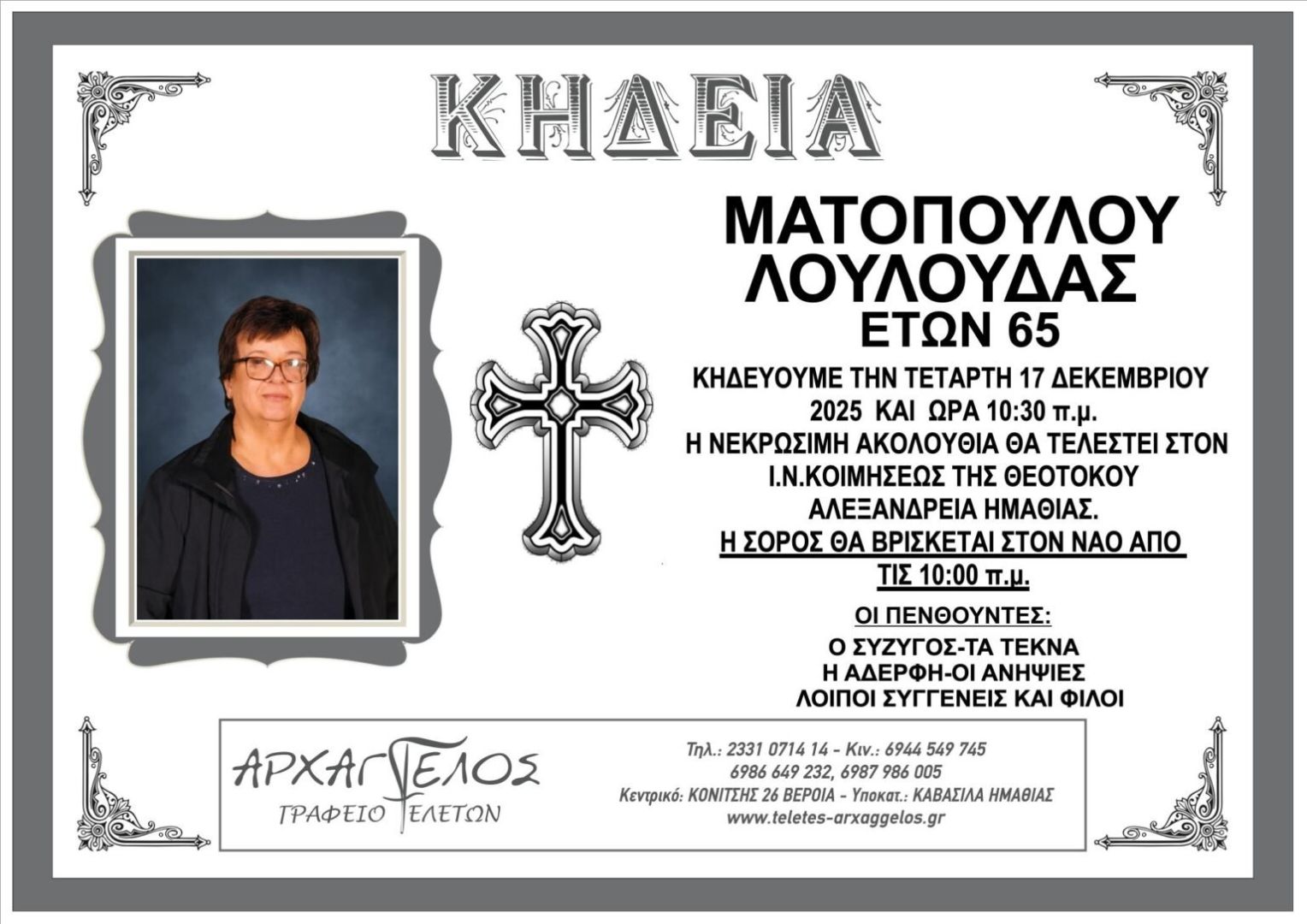 Έφυγε από τη ζωή και κηδεύεται την Τετάρτη 17 Δεκεμβρίου 2025 στις 10.30 π.μ. από τον Ιερό Ναό Κοιμήσεως της Θεοτόκου στην Αλεξάνδρεια Ημαθίας η Λουλούδα Ματοπούλου σε ηλικία 65 ετών.