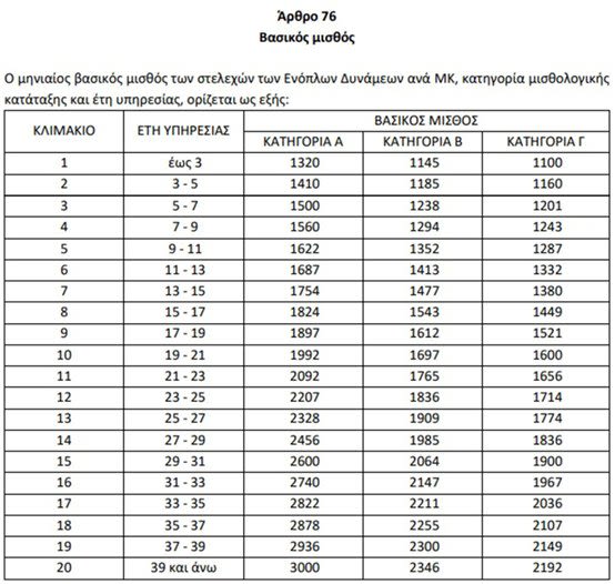 Ο μηνιαίος μισθός των στελεχών των Ενόπλων Δυνάμεων ανά μισθολογική, κατηγορία μισθολογικής κατάταξης και έτη υπηρεσίας, ορίζεται ως εξής, σύμφωνα με το νέο νομοσχέδιο: