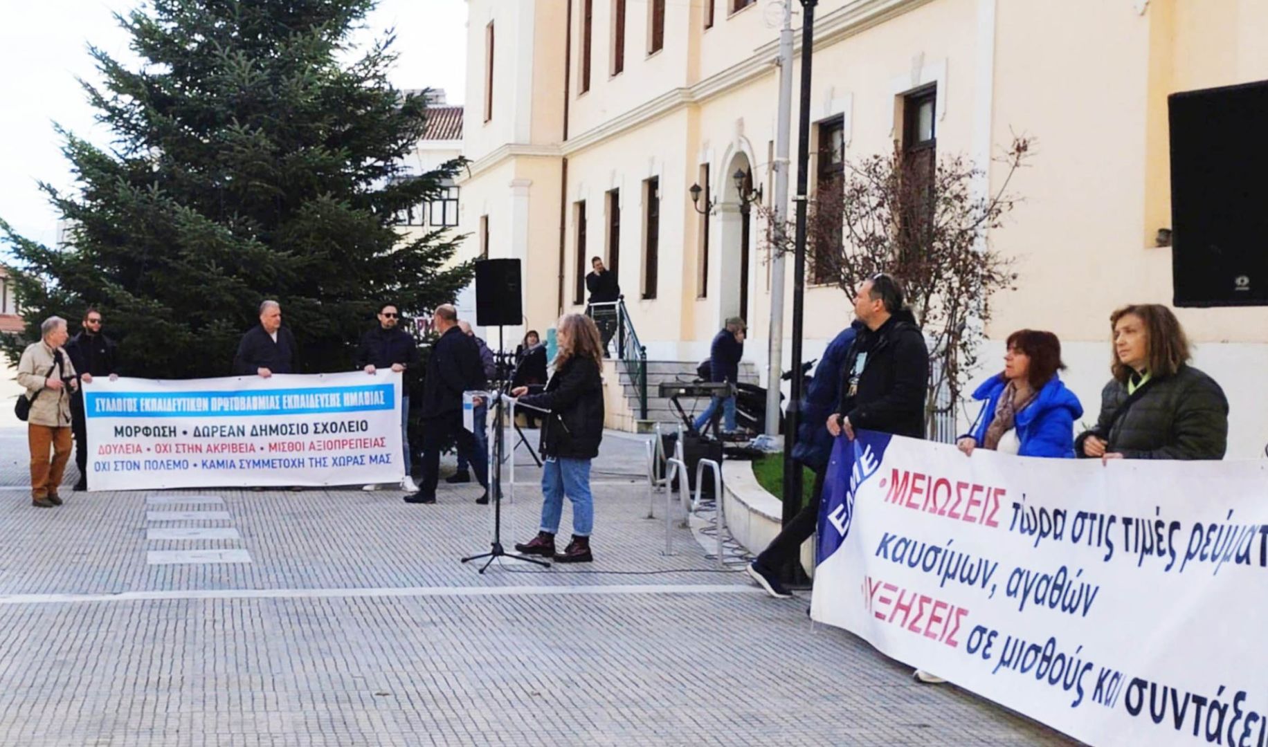Την απεργιακή συγκέντρωση χαιρέτισαν, ο πρόεδρος του ΝΤ ΑΔΕΔΥ Ημαθίας, Θόδωρος Κακαγιάννης, ο Παναγιώτης Χατζησάββας, πρόεδρος του Συλλόγου Εκπαιδευτικών Πρωτοβάθμιας Εκπαίδευσης (ΣΕΠΕ) Ημαθίας, η Χάρις Αξούριστου, πρόεδρος της ΕΛΜΕ, ο Ηλίας Νοβάκης, πρόεδρος των εργαζομένων του Νοσοκομείου Βέροιας και ο Σωτήρης Σταμάτης, πρόεδρος του Συλλόγου Δασκάλων Νάουσας.