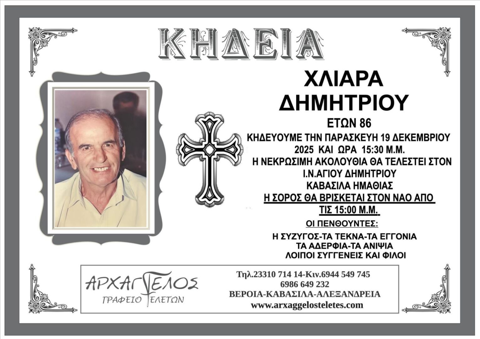 Έφυγε από τη ζωή και κηδεύτηκε σήμερα Παρασκευή 19 Δεκεμβρίου 2025 στις 3.30 μ.μ. από τον Ιερό Ναό Αγίου Δημητρίου στα Καβάσιλα Ημαθίας ο Δημήτριος Χλιάρας σε ηλικία 86 ετών.