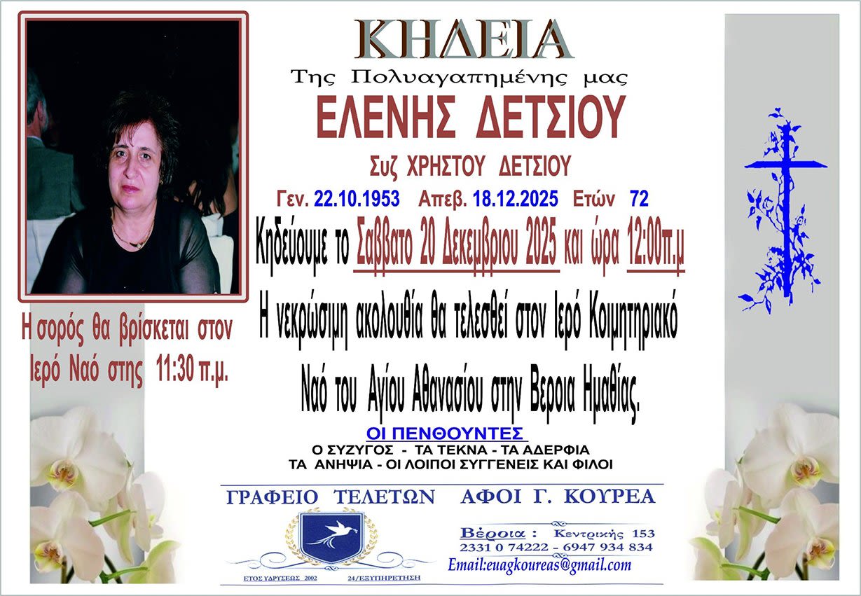 Έφυγε από τη ζωή και κηδεύεται το Σάββατο 20 Δεκεμβρίου 2025 στις 12.00 μ.μ. από τον Ιερό Ναό Αγίου Αθανασίου (Κοιμητήρια) Βέροιας η Ελένη Δέτσιου σε ηλικία 72 ετών.