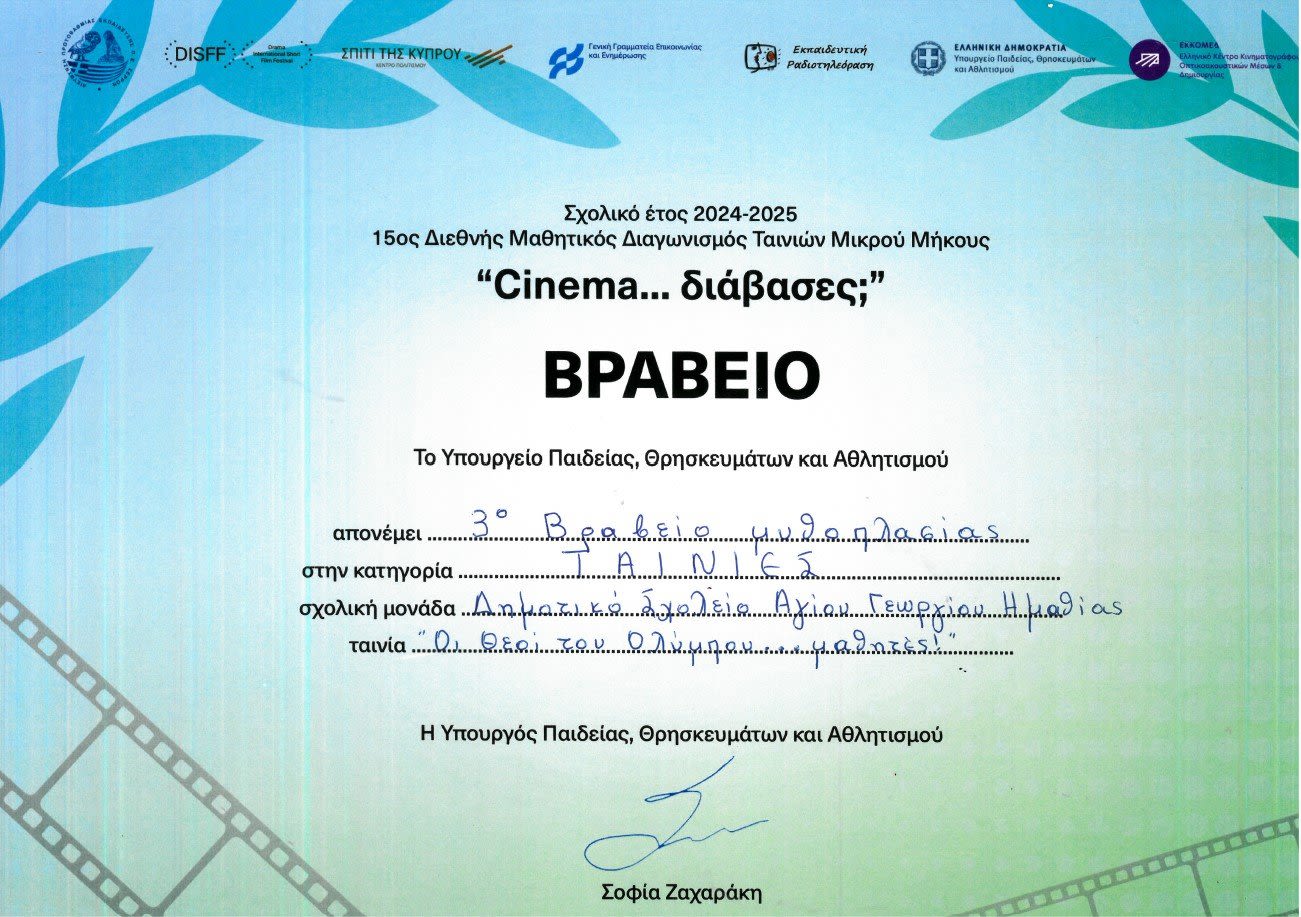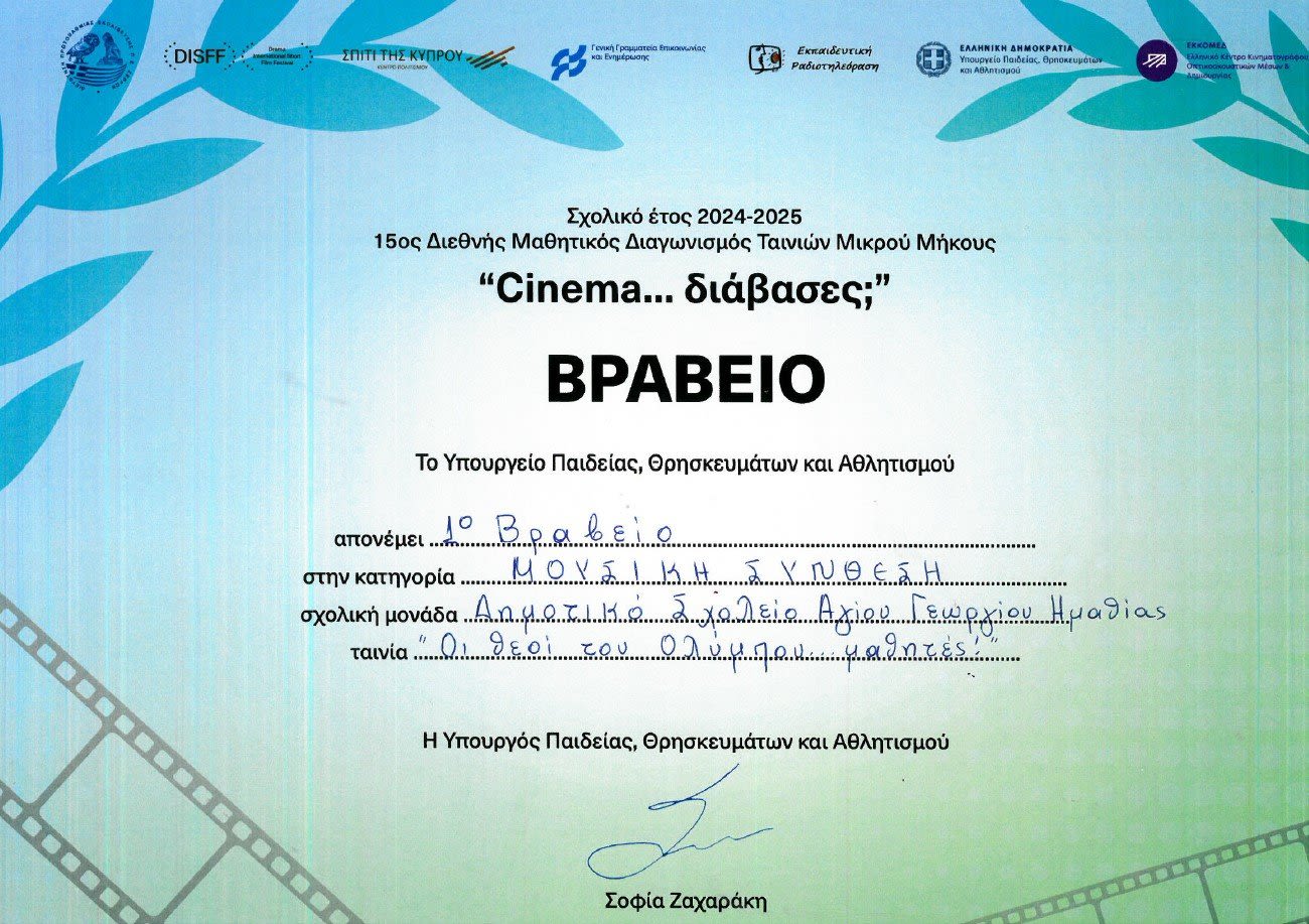 Με ιδιαίτερη υπερηφάνεια το Δημοτικό Σχολείο Αγίου Γεωργίου ανακοινώνει τη βράβευση των μαθητών/μαθητριών στο 15ο Διεθνή Μαθητικό Διαγωνισμό Ταινιών Μικρού Μήκους “Cinema…Διάβασες;” η οποία πραγματοποιήθηκε παρουσία παιδιών, εκπαιδευτικών και γονέων στις 17 Δεκεμβρίου 2025 στο Κέντρο Πολιτισμού “Ελληνικός Κόσμος”.
