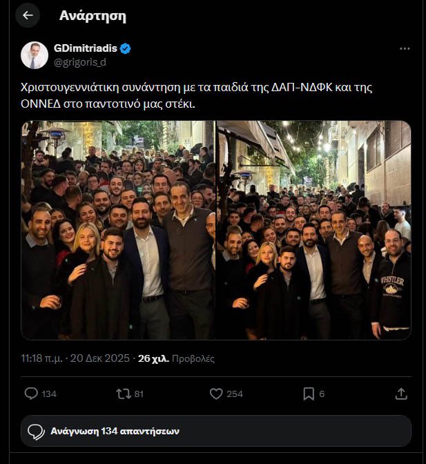 «Χριστουγεννιάτικη συνάντηση με τα παιδιά της ΔΑΠ-ΝΔΦΚ και της ΟΝΝΕΔ στο παντοτινό μας στέκι» γράφει η ανάρτηση του Γρηγόρη Δημητριάδη στο Χ και συνοδεύεται από δυο φωτογραφίες με τη μεγάλη οικογένεια των νέων της ΝΔ.