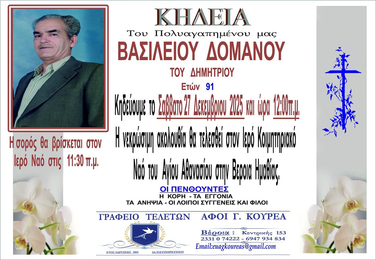 Έφυγε από τη ζωή και κηδεύεται το Σάββατο 27 Δεκεμβρίου 2025 στις 12.00 μ.μ. από τον Ιερό ναό Αγίου Αθανασίου (Κοιμητήρια) Βέροιας ο Βασίλειος Δομανος σε ηλικία 91 ετών