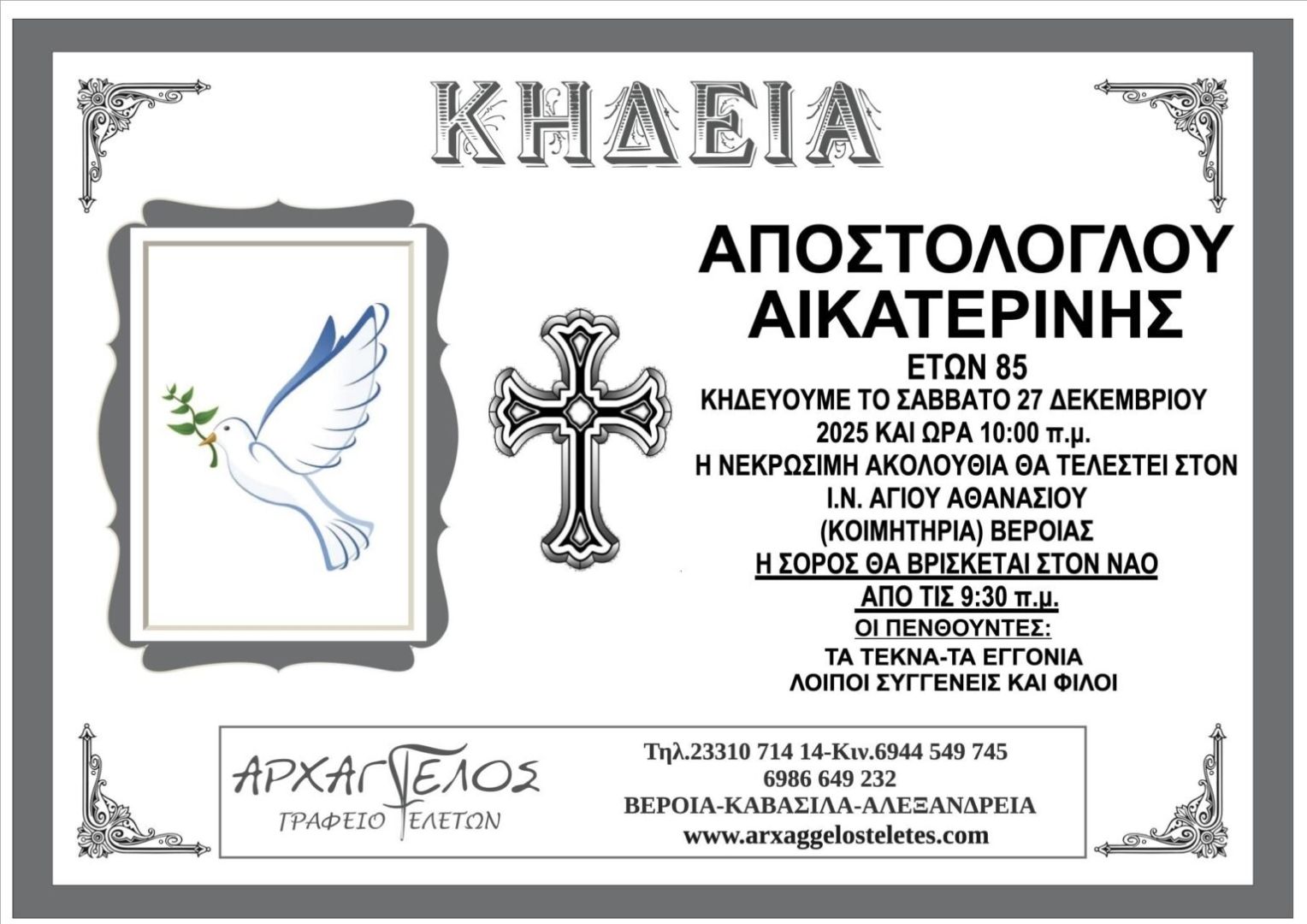 Έφυγε από τη ζωή και κηδεύεται το Σάββατο 27 Δεκεμβρίου 2025 στις 10.00 π.μ. από τον Ιερό Ναό Αγίου Αθανασίου (Κοιμητήρια) Βέροιας η Αικατερίνη Αποστόλογλου σε ηλικία 85 ετών.