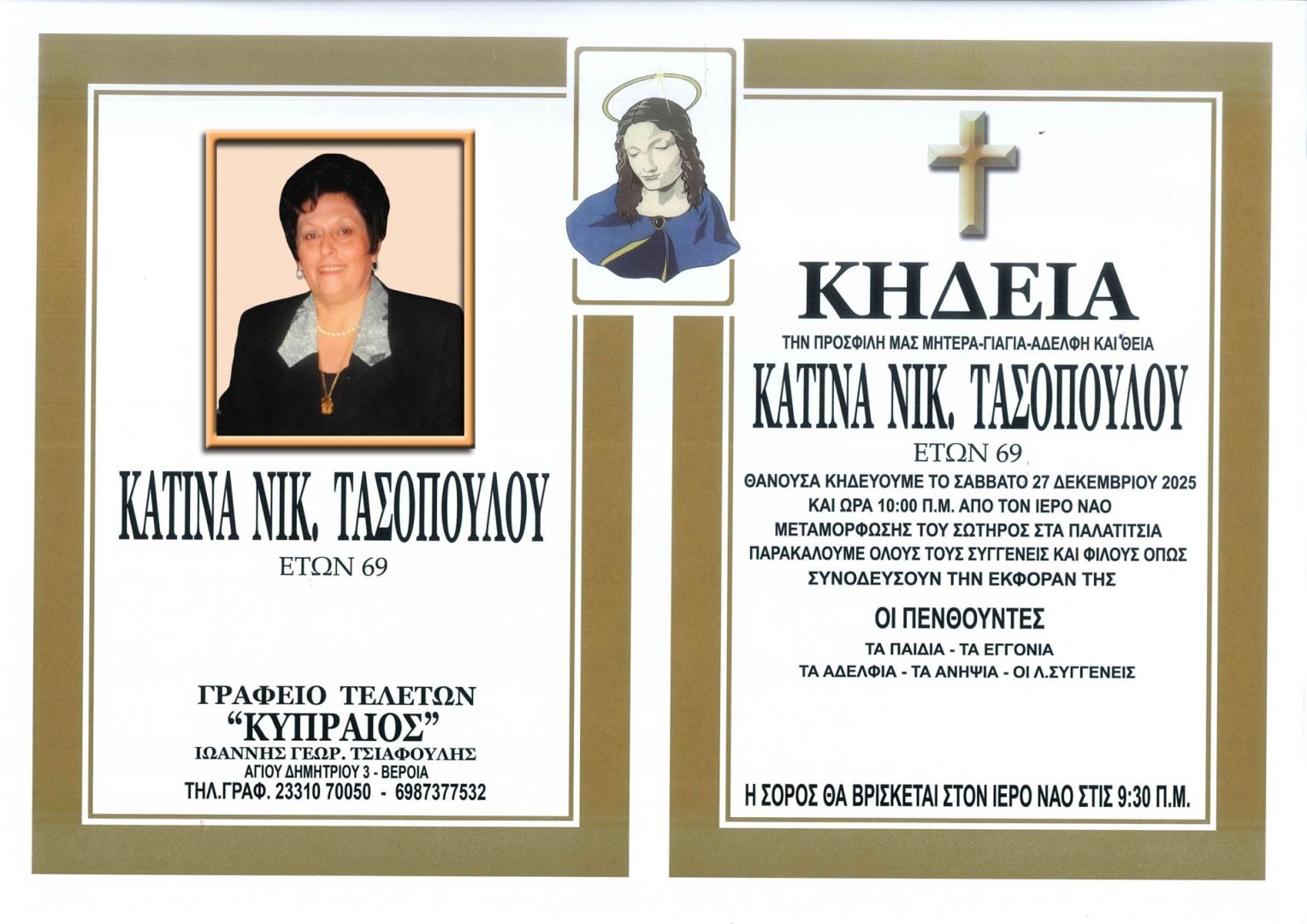 Έφυγε από τη ζωή και κηδεύεται το Σάββατο 27 Δεκεμβρίου 2025 στις 10.00 π.μ. από τον Ιερό Ναό Μεταμόρφωσης του Σωτήρος στα Παλατίτσια η Κατίνα Νικ. Τασοπούλου σε ηλικία 69 ετών.