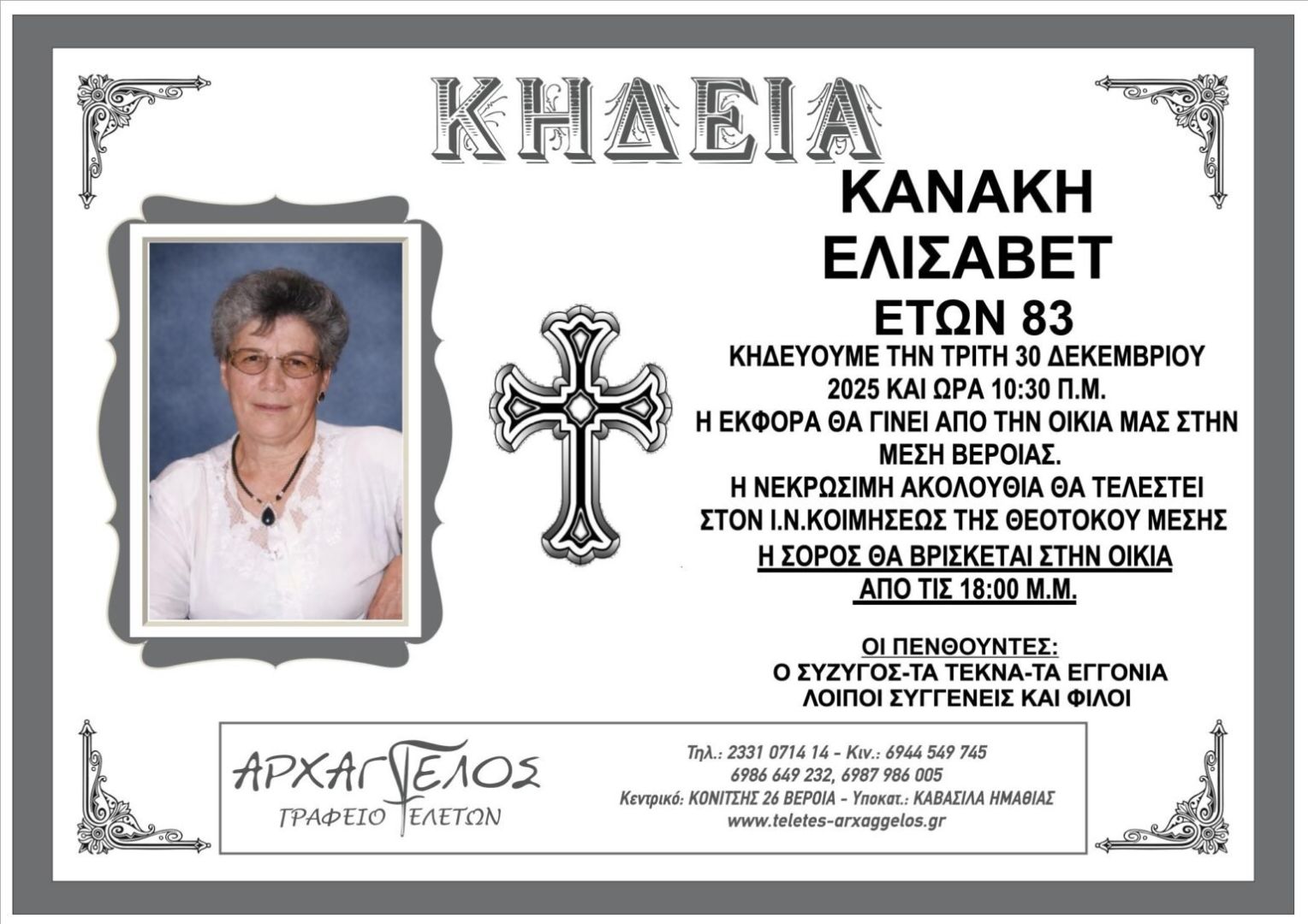 Έφυγε από τη ζωή και κηδεύεται την Τρίτη 30 Δεκεμβρίου 2025 στις 10.30 π.μ. από τον Ιερό Ναό Κοιμήσεως της Θεοτόκου Μέσης η Ελισάβετ Κανάκη σε ηλικία 83 ετών.