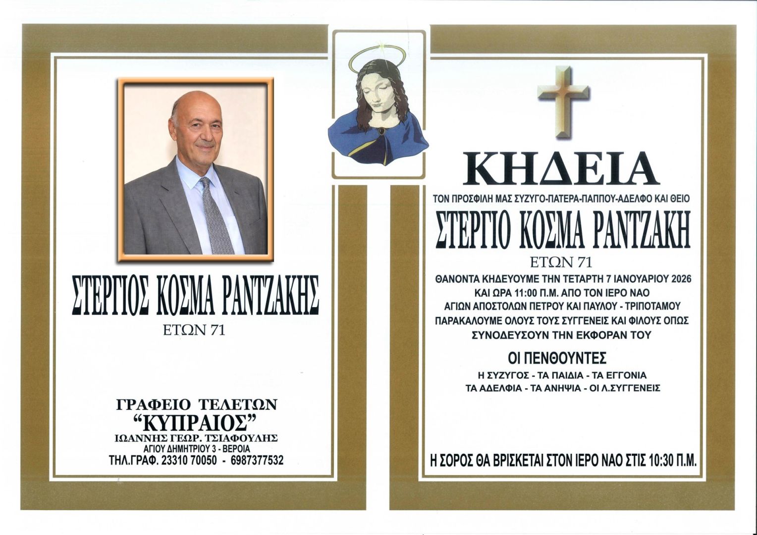 Έφυγε από τη ζωή και κηδεύεται την Τετάρτη 7 Ιανουαρίου 2026 στις 11.00 π.μ. από τον Ιερό Ναό Αγίων Αποστόλων Πέτρου και Παύλου Τριποτάμου ο Στέργιος Κοσμά Ραντζάκης σε ηλικία 71 ετών.