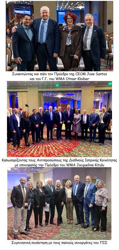 Στις επετειακές εκδηλώσεις του ΠΙΣ εξαιρετικά τιμητική όσο και συμβολική υπήρξε η παρουσία της Προέδρου του Παγκόσμιου Ιατρικού Συλλόγου Jacqueline Kitulu και του Γεν. Γραμματέα Otmar Kloiber, του Προέδρου της CPME Ole Johan Bakke, του Προέδρου της CEOM Jose Santos, του Προέδρου της UEMS Βασίλειου Παπαλόη, του Προέδρου της UEMO Tiago Villanueva Gutierrez Arruda Marques, καθώς και Προέδρων και Εκπροσώπων Ιατρικών Συλλόγων από την Ευρώπη, την Ασία και την Αφρική, επιβεβαιώνοντας τη διεθνή αναγνώριση της Ελληνικής Ιατρικής Κοινότητας.