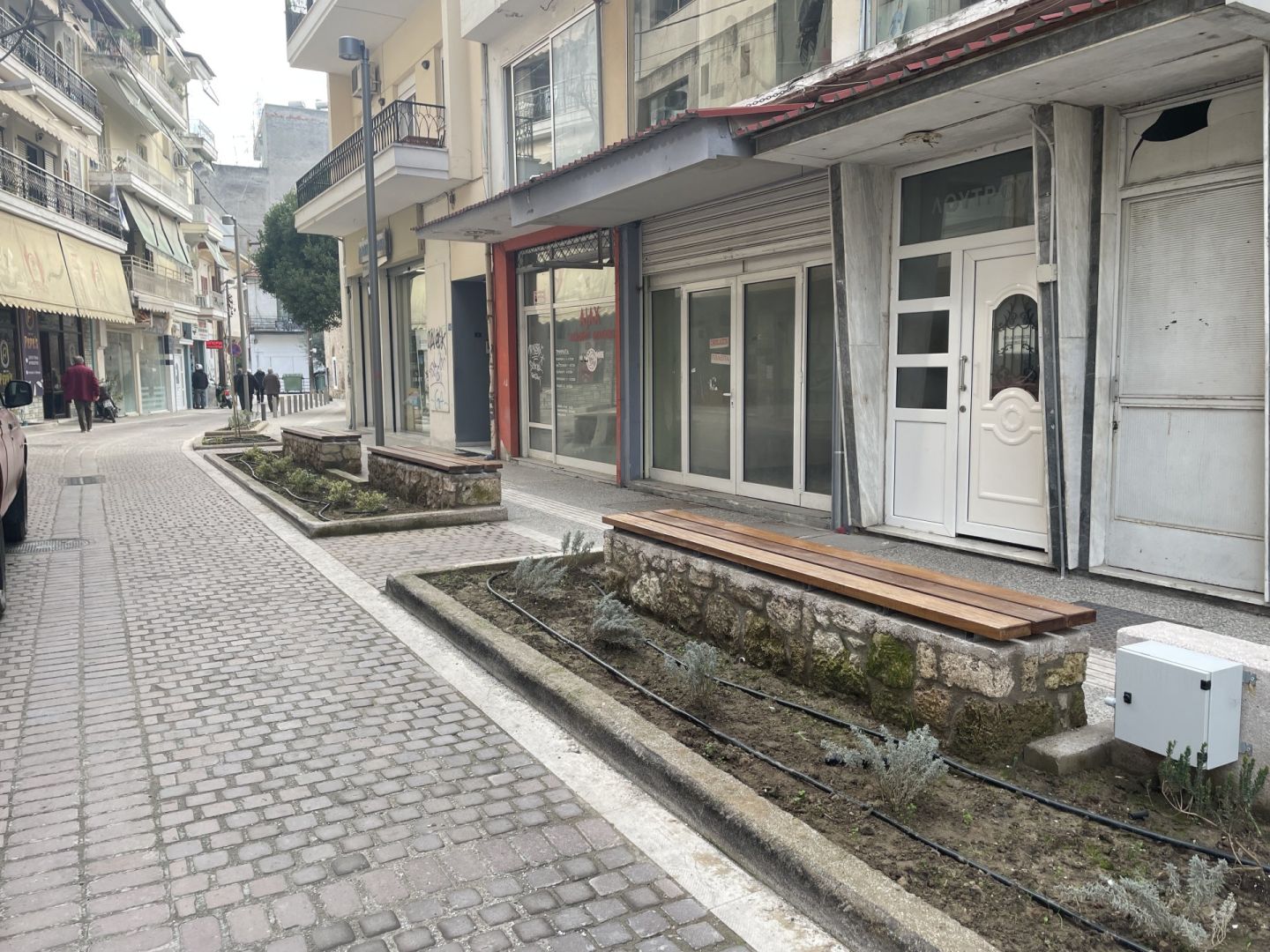 Στη δεύτερη φωτογραφία τα παγκάκια είναι στη μέση σχεδόν του πεζοδρομίου, πάλι ανάποδα στη θέα του δρόμου, μέσα σε παρτέρια με φυτά και απέναντι από τραπεζάκια που κάθονται οι θαμώνες του μαγαζιού. Πόσο άνετο και ευχάριστο θα μπορούσε να είναι;