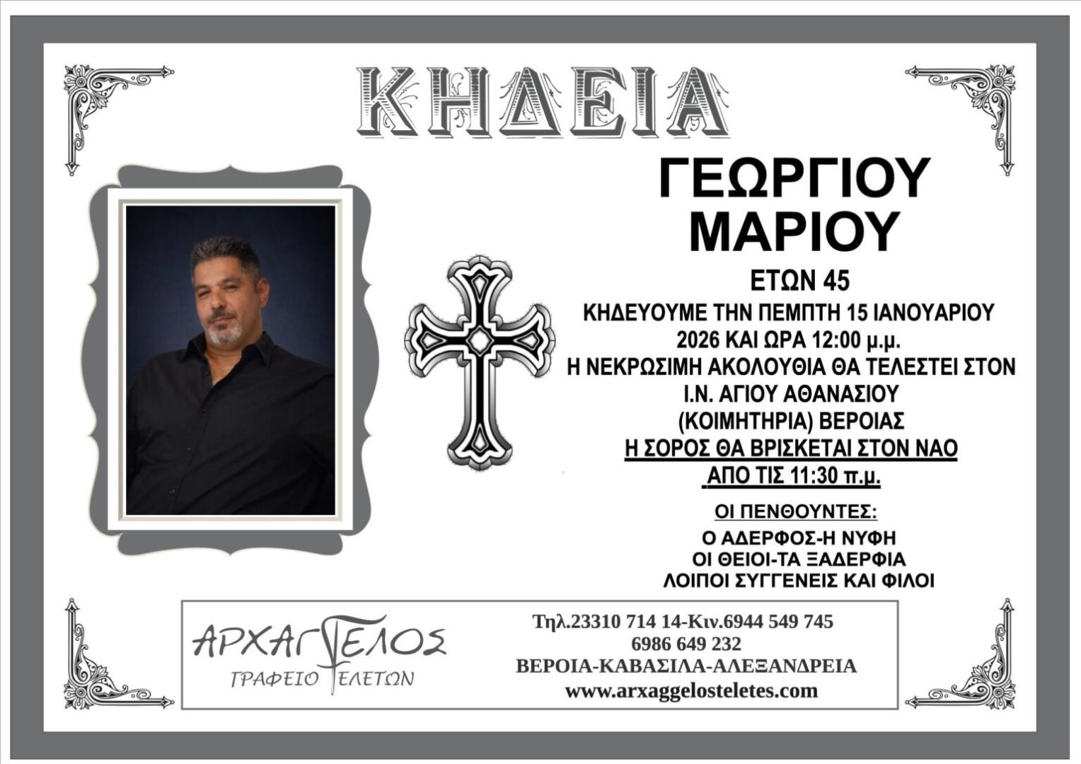 Έφυγε από τη ζωή και κηδεύτηκε σήμερα Πέμπτη 15 Ιανουαρίου 2026 στις 12.00 μ.μ. από τον Ιερό Ναό Αγίου Αθανασίου (Κοιμητήρια) Βέροιας ο Μάριος Γεωργίου σε ηλικία 45 ετών.