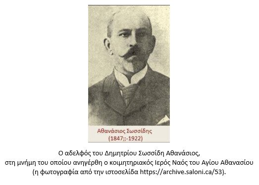 Βέρροια, Αὔγουστος. Τὴν παρελθοῦσαν Κυριακὴν παρισταμένων πολλῶν φιλοθρήσκων καὶ φιλακολούθων ἐτελέσθησαν εἰς τὸ νεκροταφεῖον τῆς πόλεώς μας τὰ ἐγκαίνια τοῦ ναοῦ τοῦ ἁγίου Ἀθανασίου, ἀνεγερθέντος εἰς μνήμην τοῦ Ἀθανασίου Σωσσίδου, ὑπὸ τῶν ἀδελφῶν Σωσσίδου.