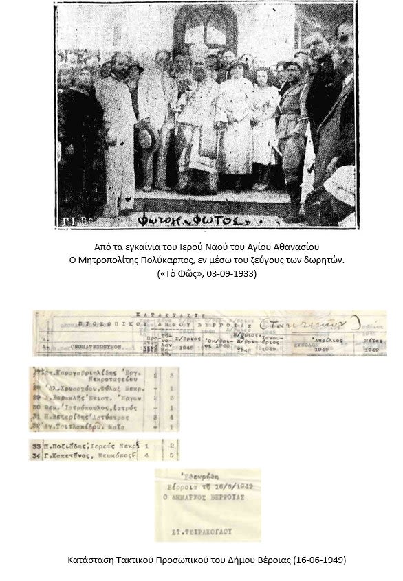 [5] π.χ.: «Κατάστασις Προσωπικού Δήμου Βερροίας» της 16-06-1949 (υπογραφόμενη από τον Δήμαρχο Στέφανο Τσιράκογλου*) στην οποία μετά τα ονοματεπώνυμα κ.λπ. στοιχεία του διοικητικού και εργατοτεχνικού προσωπικού, αναγράφονται, ως τακτικοί δημοτικοί υπάλληλοι, οι γιατροί και η μαία του Δήμου, οι εργάτες του νεκροταφείου, καθώς και ο ιερεύς και ο νεωκόρος του κοιμητηριακού Ιερού Ναού. [* Στέφανος Τσιράκογλου (1895-1975), Δήμαρχος Βέροιας από Αυγ. 1946 έως Οκτ. 1947, και από 25-07-1948 έως τέλη Αυγ. 1949].