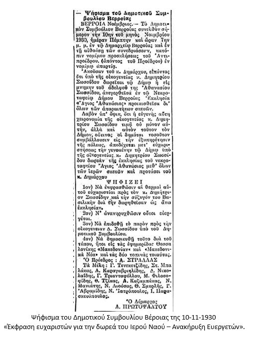 «Ἡ Ἐπιτροπὴ τοῦ Δημοτικοῦ Νεκροταφείου Βερροίας “Ἅγιος Ἀθανάσιος” γνωστοποιεῖ ὅτι τὴν προσεχῆ Κυριακὴν 20ην Αὐγούστου τελοῦνται τὰ ἐγκαίνια τοῦ ἐν αὐτῷ δαπάναις τοῦ Μεγάλου Εὐεργέτου τοῦ Νεκροταφείου κ. Τάκη Σωσσίδου καὶ εἰς μνήμην τοῦ ἀδελφοῦ του Ἀθανασίου ἀνεγερθέντος φερωνύμου Ἱεροῦ Ναοῦ.