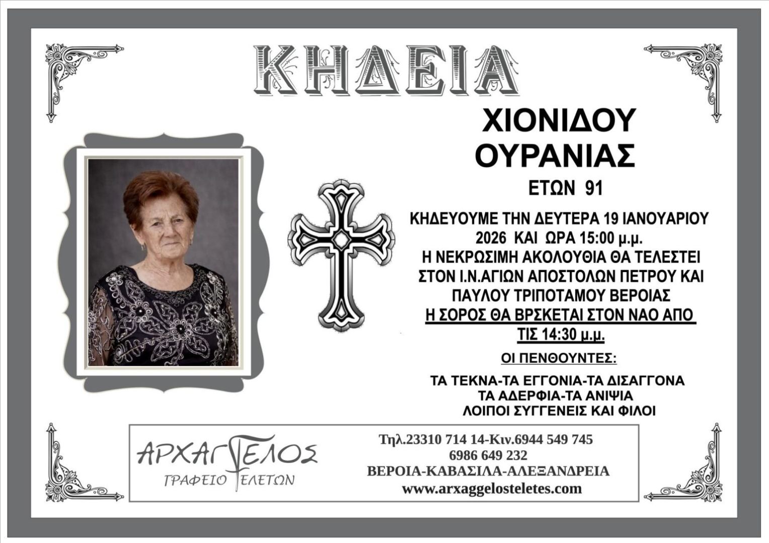 Έφυγε από τη ζωή και κηδεύεται την Δευτέρα 19 Ιανουαρίου 2026 στις 3.00 μ.μ. από τον Ιερό Ναό Αγίων Αποστόλων Πέτρου και Παύλου Τριποτάμου Βέροιας η Ουρανία Χιονίδου σε ηλικία 91 ετών.