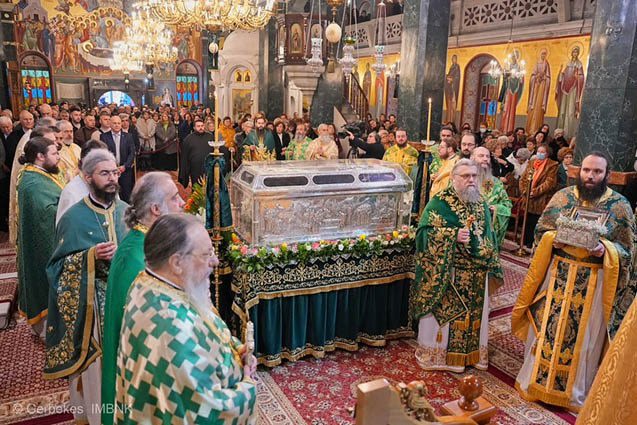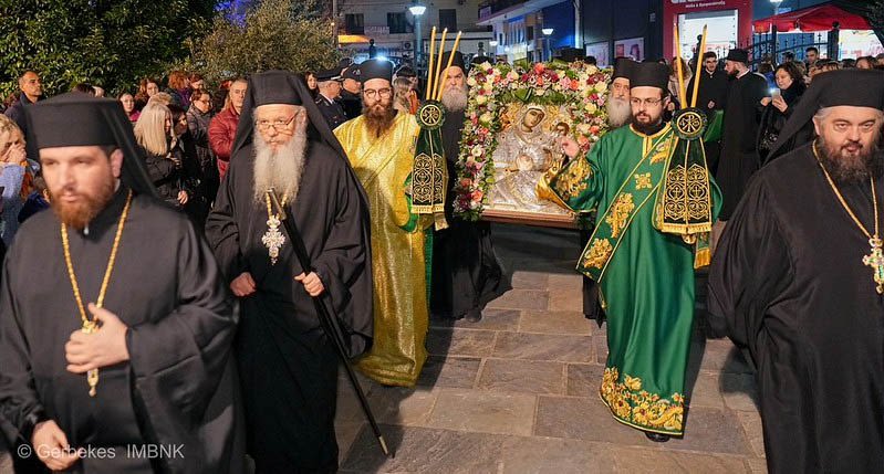 Στο Ι. Ναό, εψάλησαν τα εγκώμια του Οσίου Αντωνίου και ακολούθησε λιτανεία του Ιερού Λειψάνου του Οσίου και της Ιεράς Εικόνος της Παναγίας Δοβρά σε κεντρικούς δρόμους της πόλης.