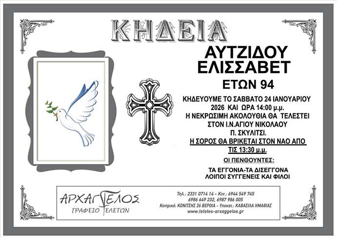 Έφυγε από τη ζωή και κηδεύτηκε σήμερα Σάββατο 24 Ιανουαρίου 2026 στις 14.00 μ.μ. από τον Ιερό Ναό Αγίου Νικολάου - Π. Σκυλιτσι, η Ελισσάβετ Αυτζίδου σε ηλικία 94 ετών.