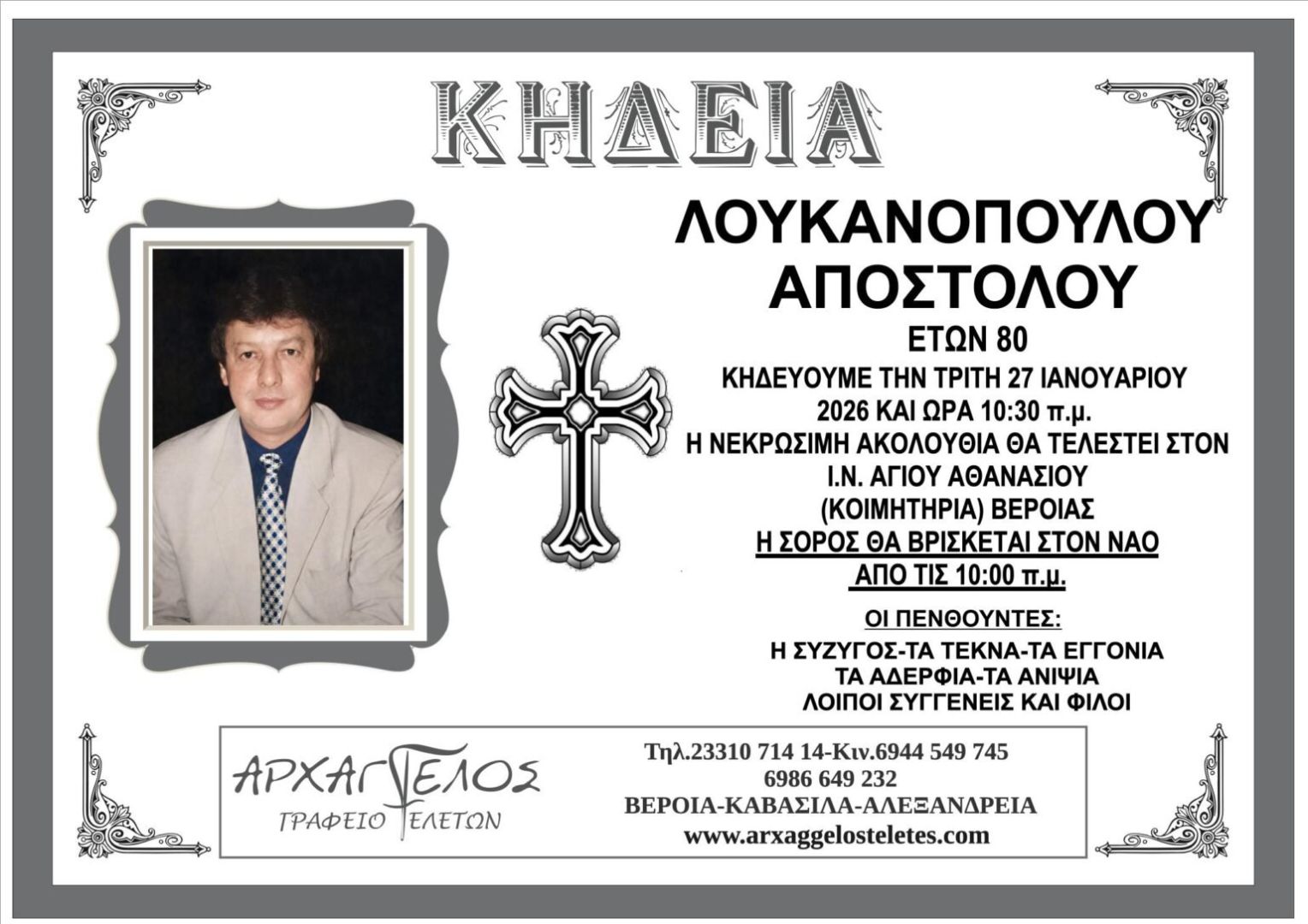 Έφυγε από τη ζωή και κηδεύεται την Τρίτη 27 Ιανουαρίου 2026 στις 10.30 π.μ. από τον Ιερό Ναό Αγίου Αθανασίου (Κοιμητήρια) Βέροιας ο Απόστολος Λουκανόπουλος σε ηλικία 80 ετών.