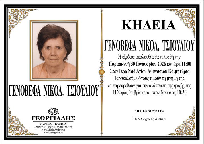 Έφυγε από τη ζωή και κηδεύεται την Παρασκευή 30 Ιανουαρίου 2026 στις 11.00 π.μ. από τον Ιερό Ναό Αγίου Αθανασίου (Κοιμητήρια) Βέροιας η Γενοβέφα Νικολ. Τσιούλιου.