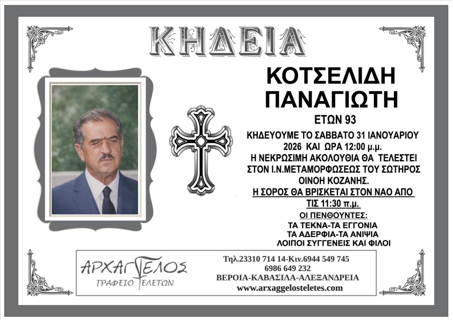 Έφυγε από τη ζωή και κηδεύεται το Σάββατο 31 Ιανουαρίου 2026 στις 12.00 μμ. από τον Ιερό Ναό Μεταμορφώσεως του Σωτήρος στην Οινόη Κοζάνης ο Παναγιώτης Κοτσελίδης σε ηλικία 93 ετών.