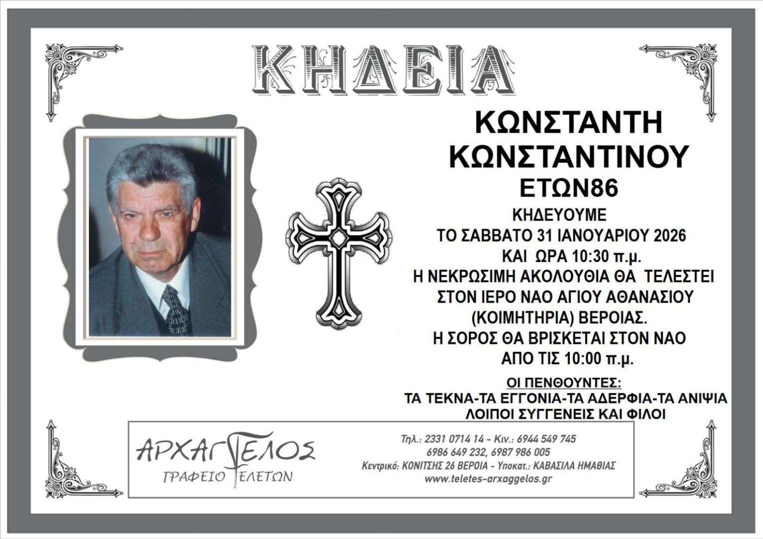 Έφυγε από τη ζωή και κηδεύεται το Σάββατο 31 Ιανουαρίου 2026 στις 10.30 π.μ. από τον Ιερό Ναό Αγίου Αθανασίου (Κοιμητήρια) Βέροιας ο Κωνσταντίνος Κωνσταντής σε ηλικία 86 ετών.