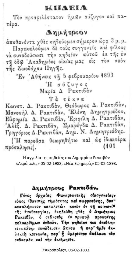 Γόνος ἀρχαίας Φαναριωτικῆς οἰκογενείας, τῦπος ἰδανικῆς τιμιότητος καὶ σωφροσύνης, δυσαναπλήρωτον καταλιπὼν κενὸν ἐν τῇ κοινωνίᾳ τῆς ἀγαθοεργίας, ἐκηδεύθη χθὲς {= 05-02-1893} ὁ Δημήτριος Ρακτιβάν, ὁ σεβαστὸς ἐν κρυπτῷ προστάτης πολυαρίθμων ἐνδεῶν. Τὴν κηδείαν του ἐπιβλητικωτάτην συνώδευσεν ἅπασα ἡ παρ᾿ ἡμῖν ἐκλεκτὴ κοινωνία, παρ᾿ ᾗ ἀμέριστον ἀπέλαυε τὸν σεβασμὸν καὶ τὴν ἐκτίμησιν.»
