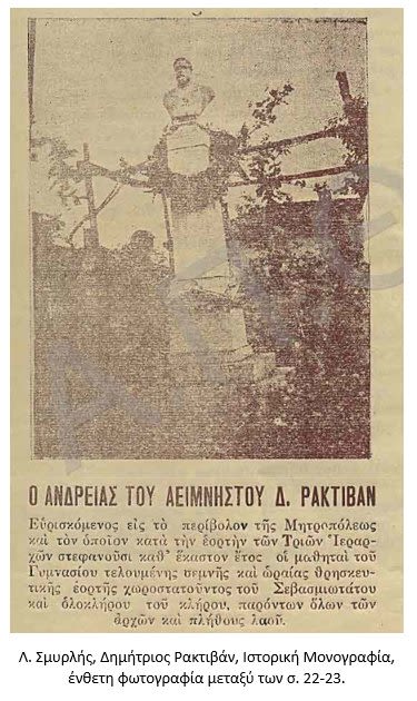 «Εἰς τὸν Μητροπολιτικὸν Ναὸν ἐπὶ τῇ ἑορτῇ τῶν Τριῶν Ἰεραρχῶν ἐγένετο προχθὲς τὸ ἐτήσιον μνημόσυνον τῶν Μεγάλων Εὐεργετῶν […] Μετὰ τὸ πέρας τῆς λειτουργίας ἐγένετο ἡ στέψις τοῦ ἀνδριάντος τοῦ ἀειμνήστου Δ. Ρακτιβὰν ὑπὸ τῆς Μαθητιώσης Νεολαίας.»